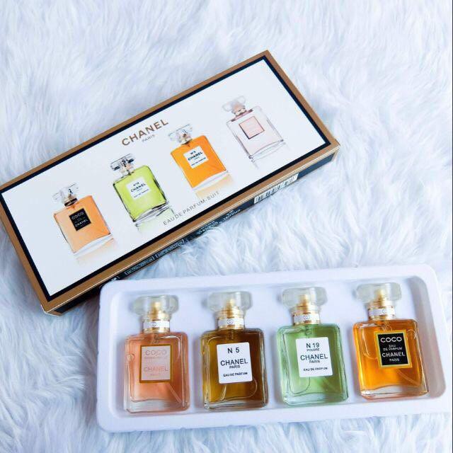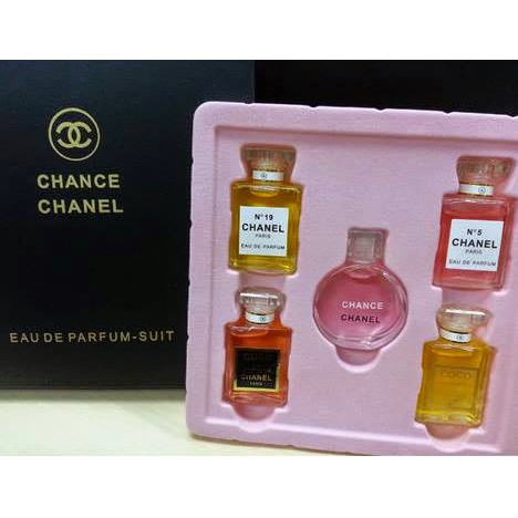 Chanel fragrance wardrobe miniature gift set of 5 five parfum chanel n05 coco mademoiselle chanel n019 allure and coco chanel each 012 fl oz 35 ml in miniature perfum bottle in a deluxe chanel gift box.